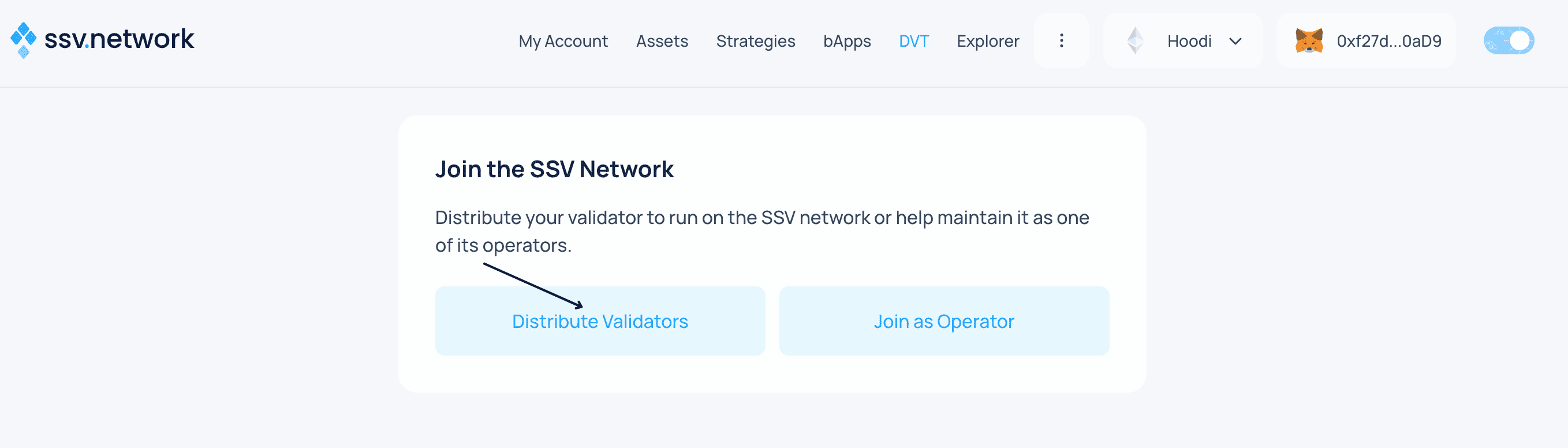 SSV Network ↗ is a permissionless DVT network that provides a simple infrastructure for splitting and distributing a validator key into multiple key shares to run a validator across multiple non-trusting nodes.