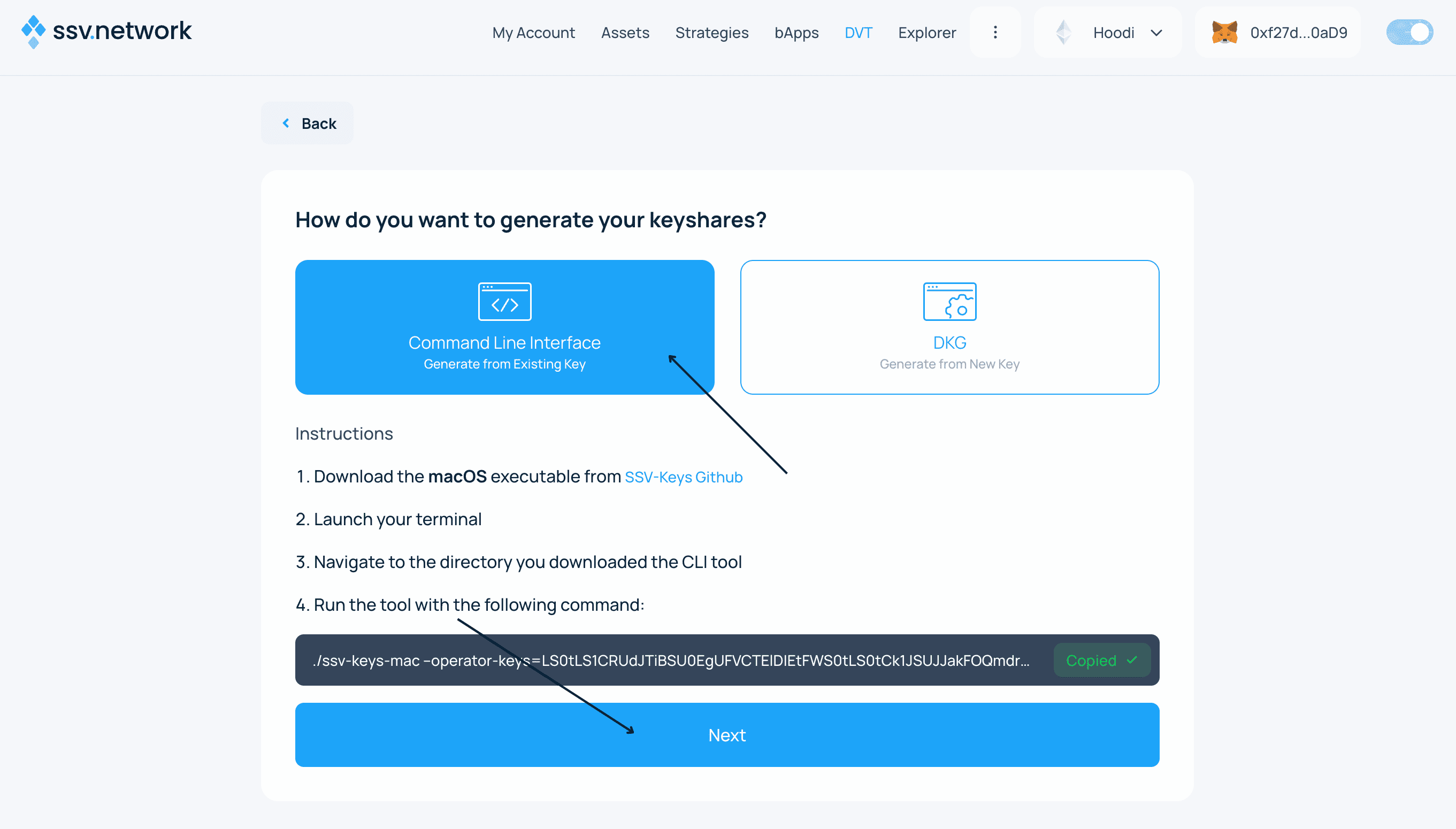 - Select Command Line Interface, copy the command provided with all values pre-filled (operator keys, IDs, your wallet address, and nonce), and press Next